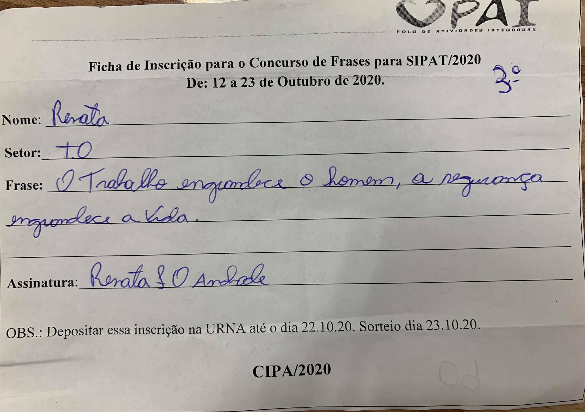 Hoje foi o dia do encerramento do Concurso de Frases SIPAT 2020. Foi escolhido dentre tantas, 3 frases, concorrendo a 3 prêmios sendo: 1º Lugar, Cleide Mary, 2º lugar, Sônia e em 3º Lugar, Renata.
